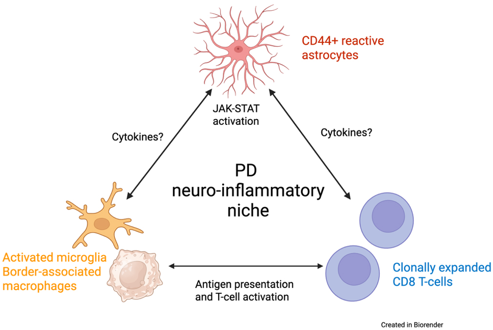 In summary, our study provided a detailed, single-cell, and spatially localized map of the neurodegenerative niche in PD. Furthermore, our findings provide a direct link between a reactive astrocyte state characterized by an elevated CD44 expression and neurodegeneration, as we have observed in Huntingtonās disease, as well as neuroinflammation, given the involvement of clonally expanded T cells in the pathology. This result is particularly promising because it moves beyond mere observation and identifies CD44 as a potential therapeutic target, not only in PD, but also in other neurodegenerative diseases. We now have NIH funding to pursue this target in Alzheimerās disease. By blocking CD44, we might be able to interrupt the vicious cycle of neuroinflammation, offering a new strategy to slow the progression of neurodegenerative diseases.
