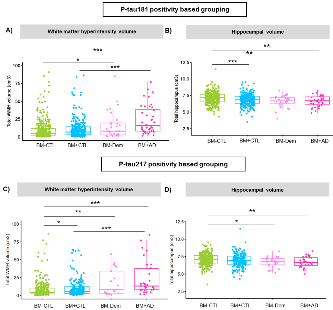 Figure 3. Comparison of neuroimaging measures across clinical groups defined by P-tau181 (top panels) and P-tau217 (bottom panels). White matter hyperintensity volume is shown on the left (A, C) and hippocampal volume on the right (B, D). Group differences are indicated with significance levels (*p < 0.05; **p < 0.01; **p < 0.001).